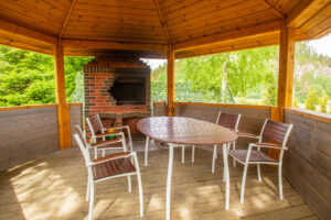 Veranda with brick brazier. Place for cooking barbecue. Outdoor fireplace. Alcove. Cooked food on the coals. |